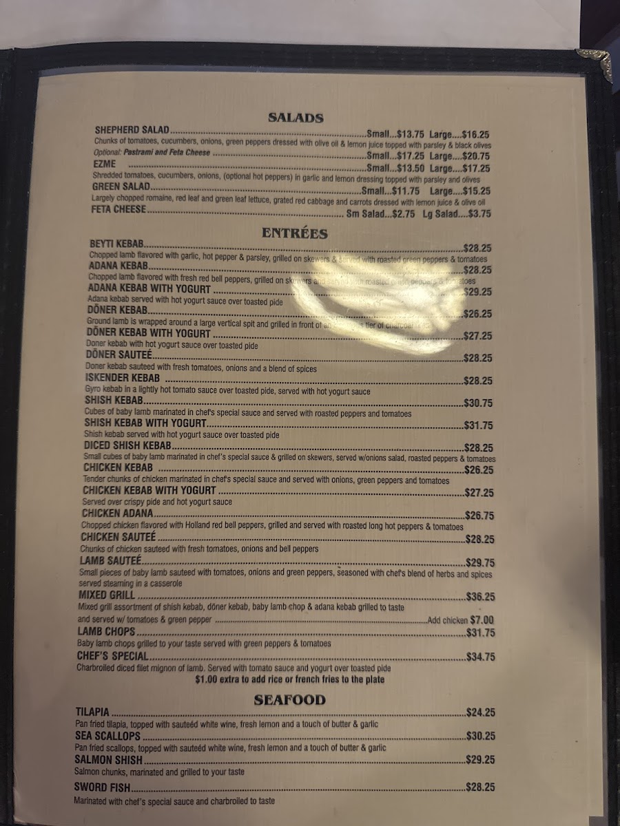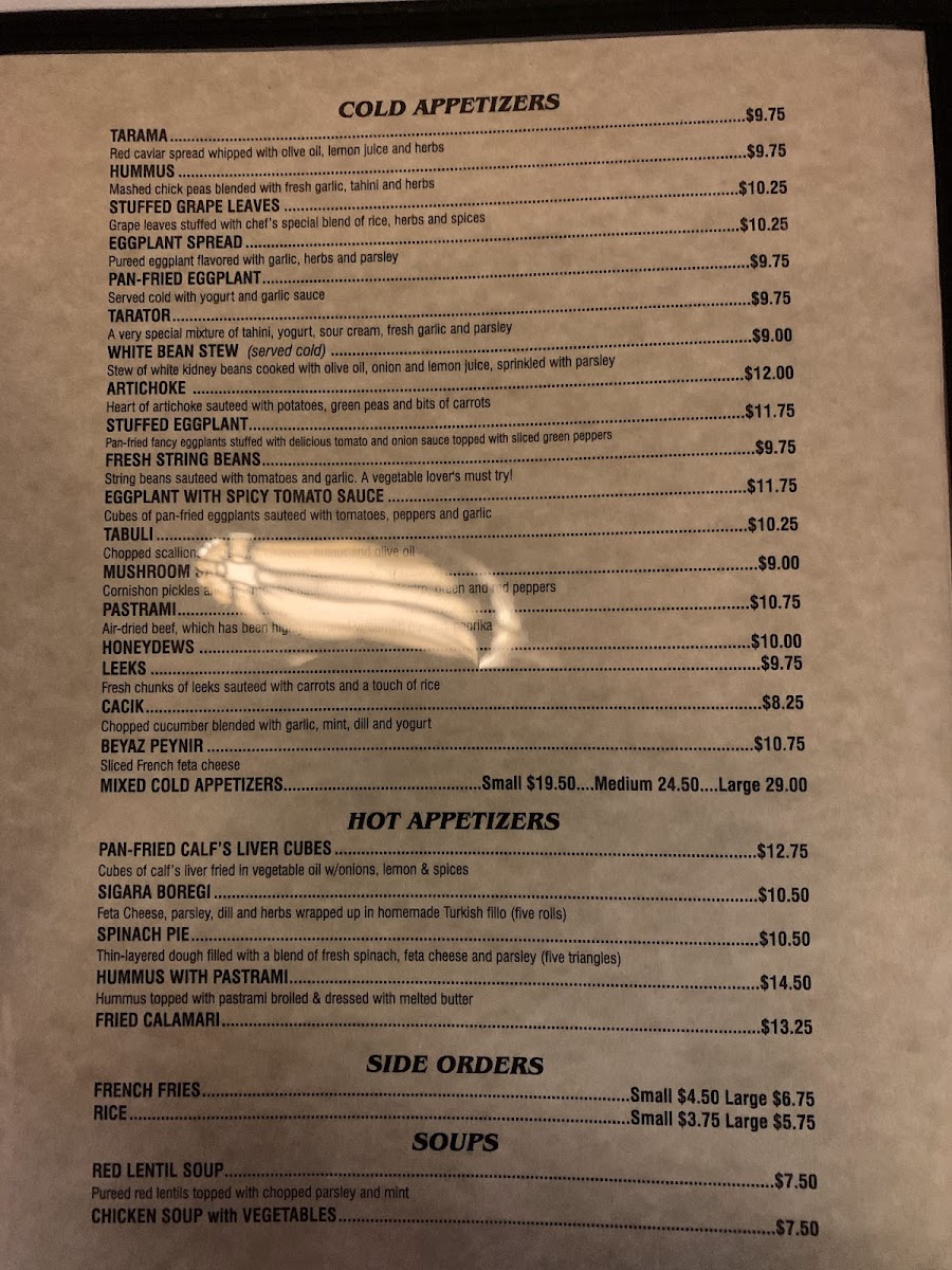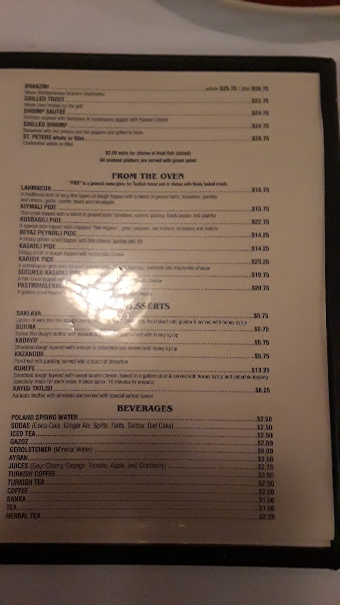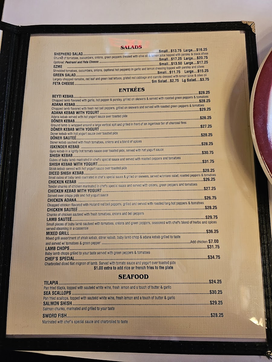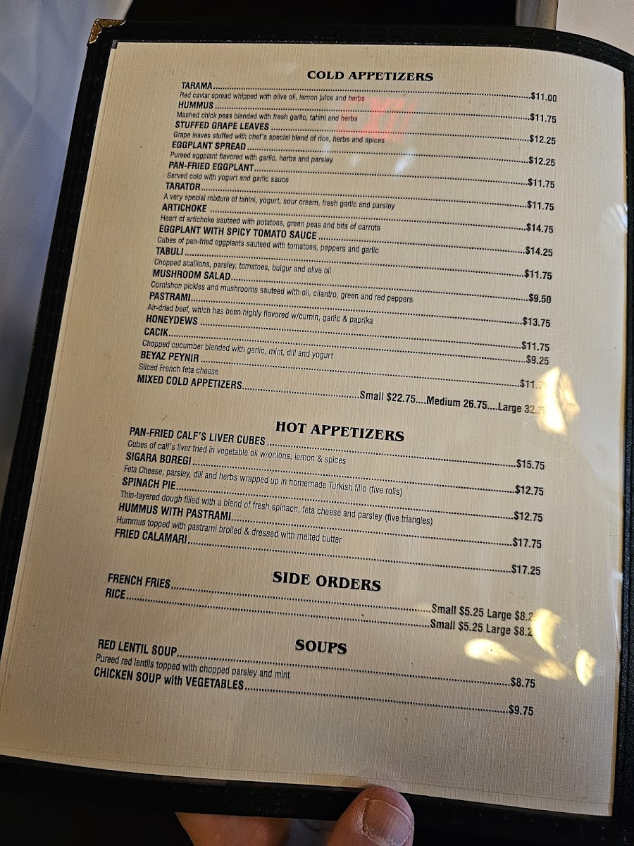 The menu here is an expansive journey through the rich culinary landscape of Turkey. Starting off, indulge in their Panfried Calf's Liver Cubes, expertly prepared to highlight the tender texture of the liver, complemented by sautéed onions, lemon, and a medley of spices—all for just $14. Or, savor the crispy Sigara Boregi, with a luscious feta cheese filling wrapped in homemade Turkish fillo, perfect for sharing or enjoying solo at $11.